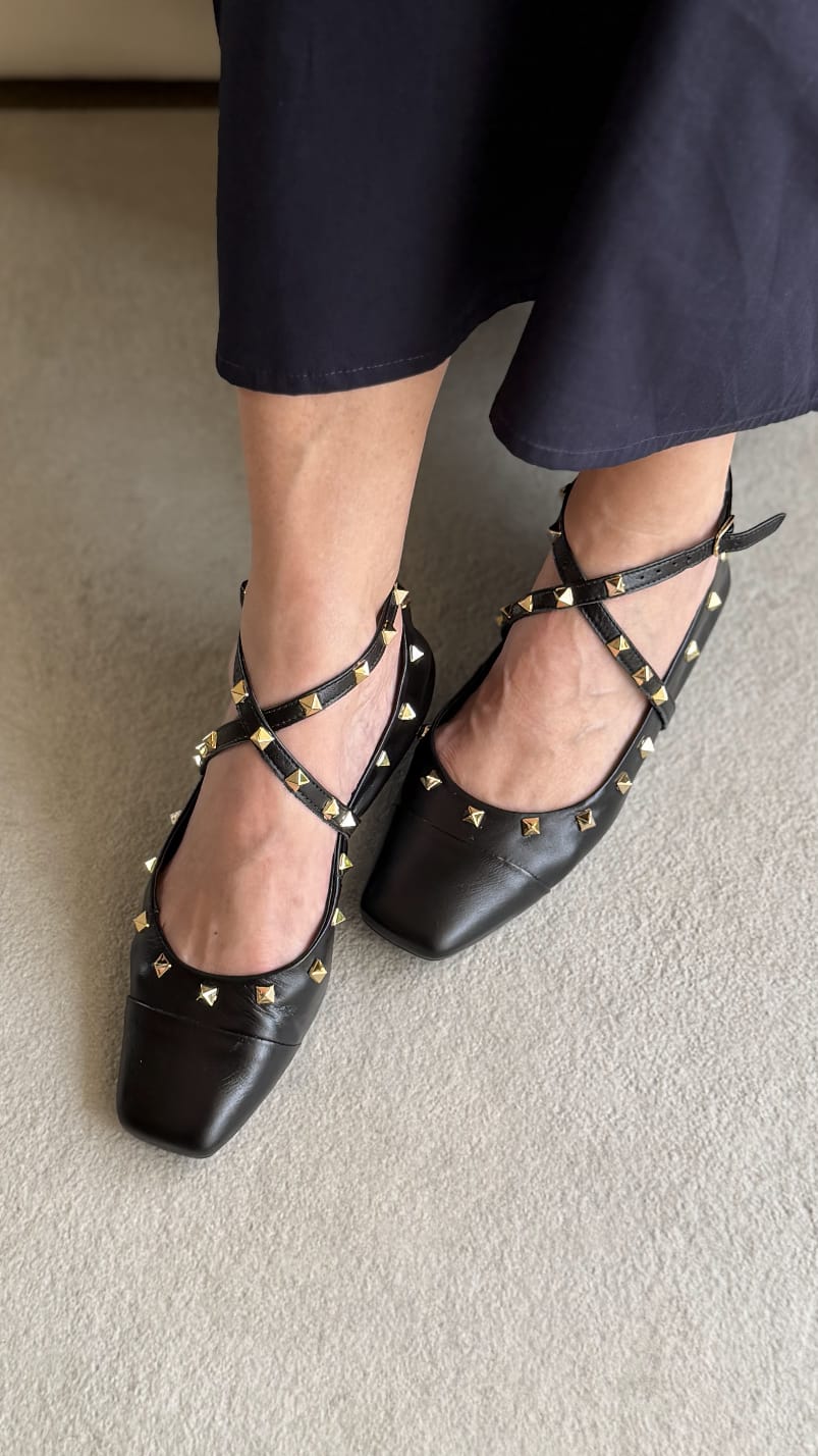 A Sapatilha boneca é um clássico, que combina com os mais variados estilos e ocasiôes. A Dominique ganha charme extra com tiras cruzadas e aplicação dos spikes metalizados. Confeccionada em couro macio e solado flexível, proporciona um calce extremamente confortável. É um item indispensável em seu guarda-roupa!