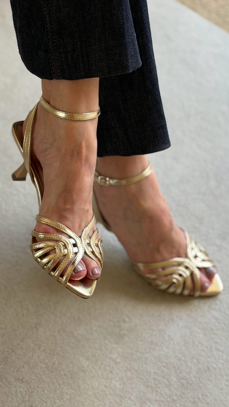 Sandália delicada e atemporal , com tiras fechadas no cabedal e bico folha que alonga a silhueta. O salto taça baixo garante conforto no dia a dia.