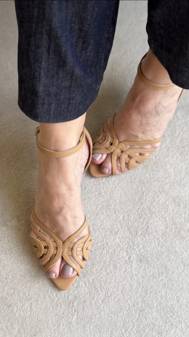 Sandália delicada e atemporal , com tiras fechadas no cabedal e bico folha que alonga a silhueta. O salto taça baixo garante conforto no dia a dia.