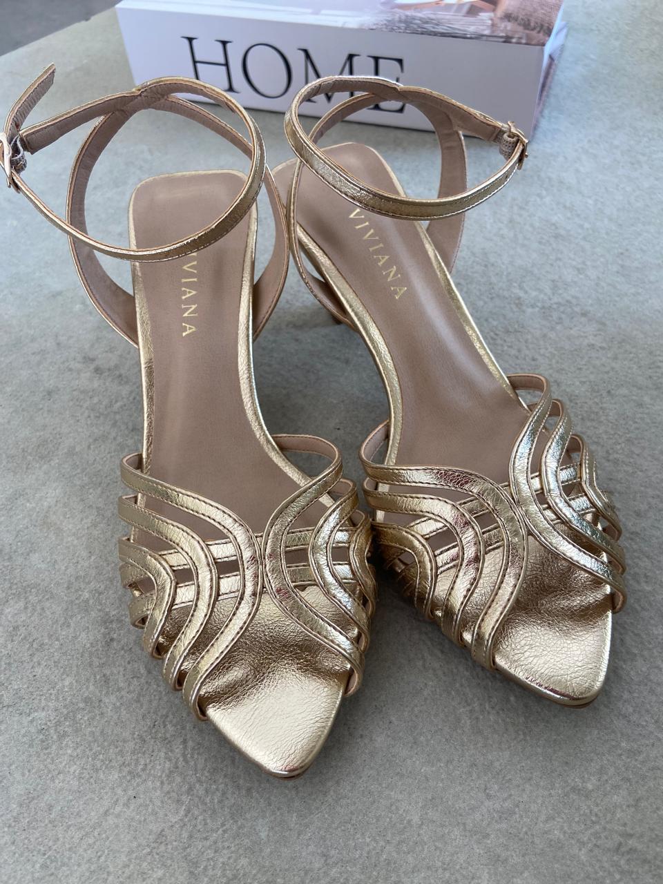 Sandália delicada e atemporal , com tiras fechadas no cabedal e bico folha que alonga a silhueta. O salto taça baixo garante conforto no dia a dia.