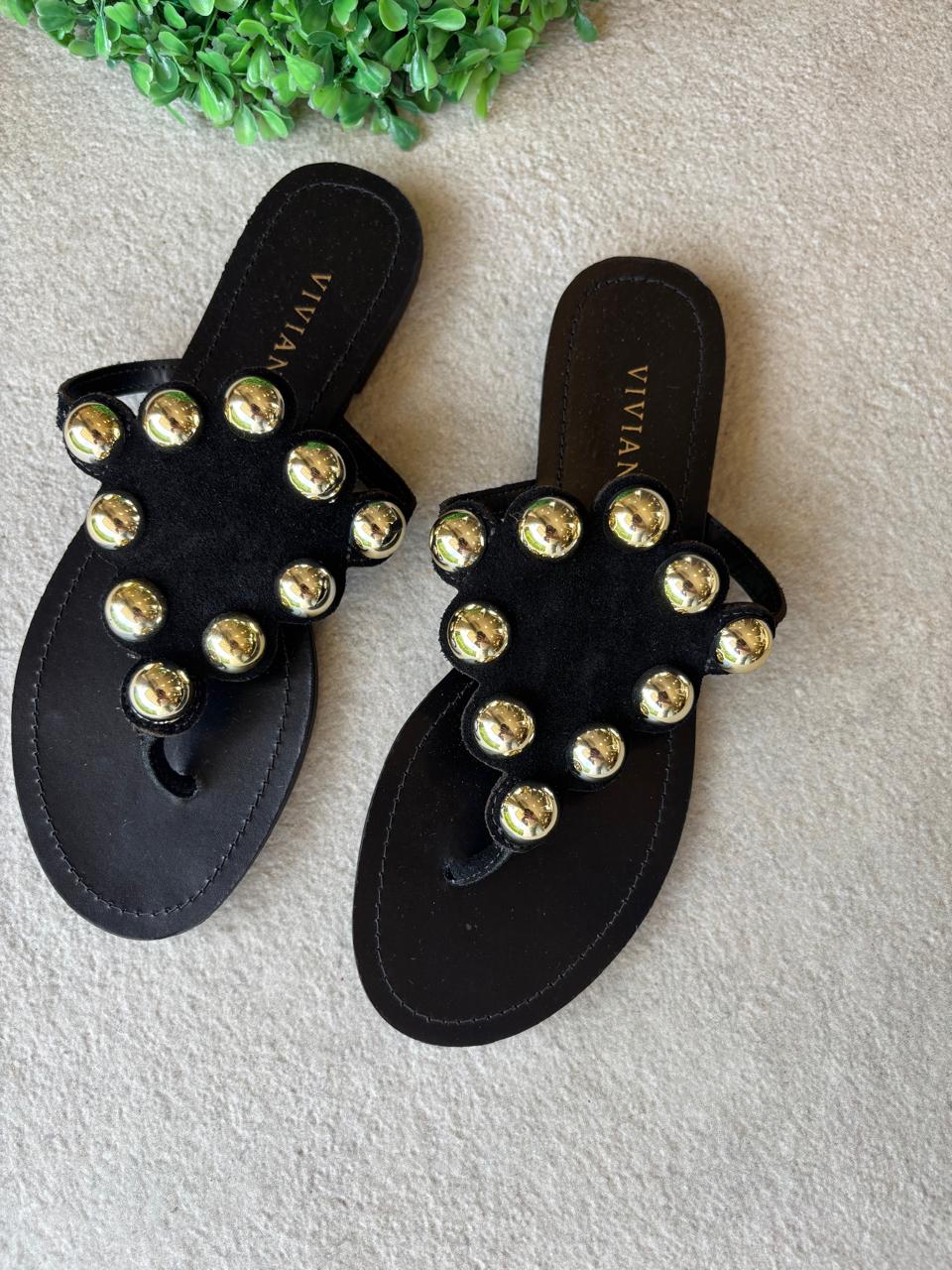 Rasteira que traduz estilo. Os enfeites no tom ouro dão o toque de sofisticação e atemporalidade. Perfeita para diversas produções.