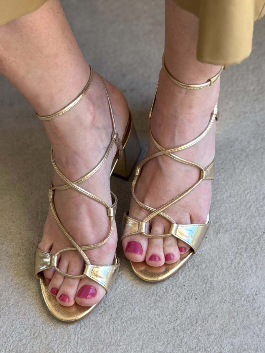 A sandália de tiras finas é elegante e versátil, perfeita para quem busca um toque sofisticado em suas produções. O salto bloco garante conforto, enquanto o acabamento metalizado adiciona um toque moderno e delicado ao visual.
