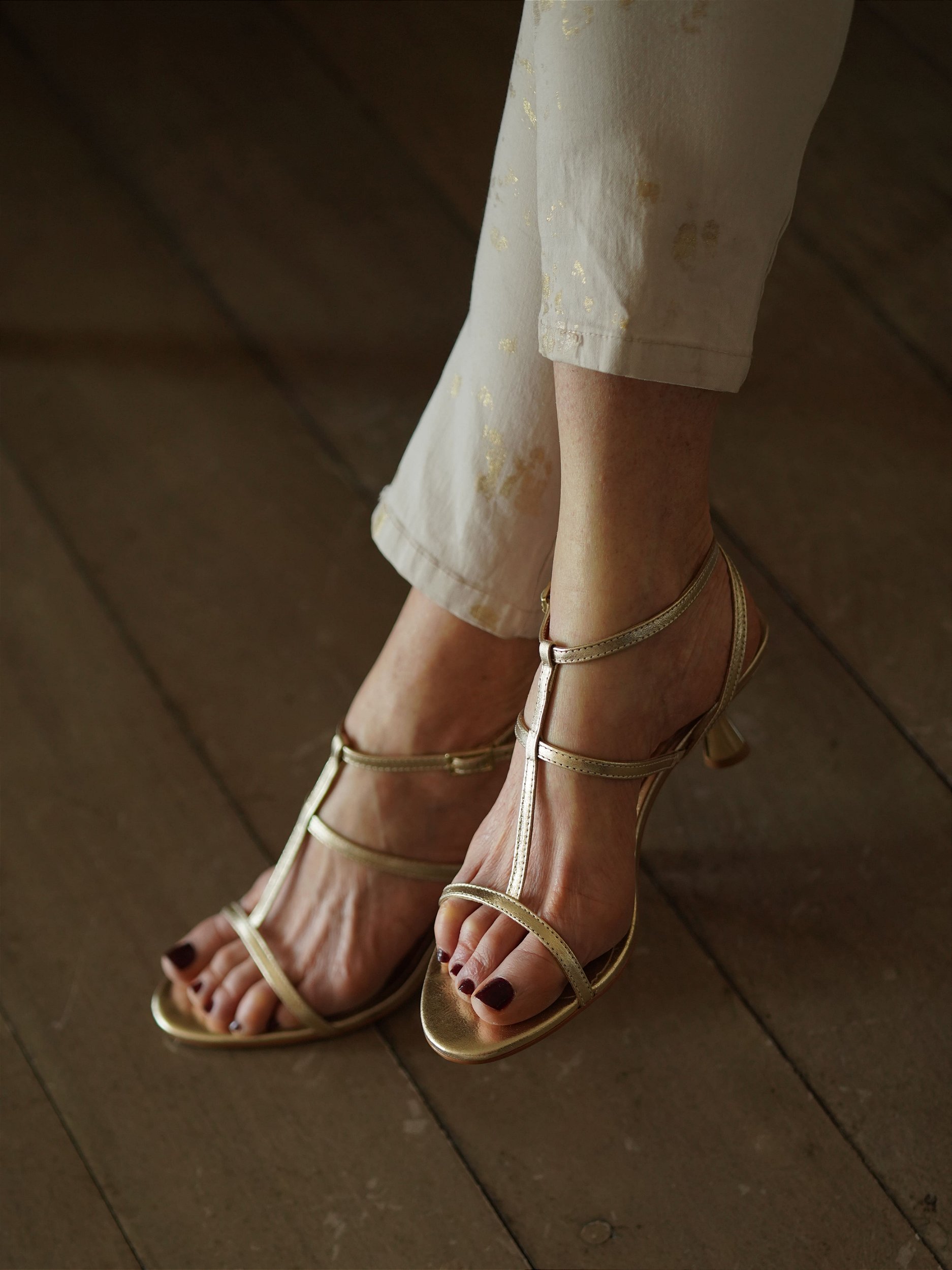Sandália delicada, tiras finas sobre os dedos e peito dos pés, fechamento lateral com fivela. Palmilha toda em couro, conta com salto metalizado estilo taça, trazendo conforto aos pés. Perfeita para festas, calça alfaiataria e jeans, dando sofisticação ao look.