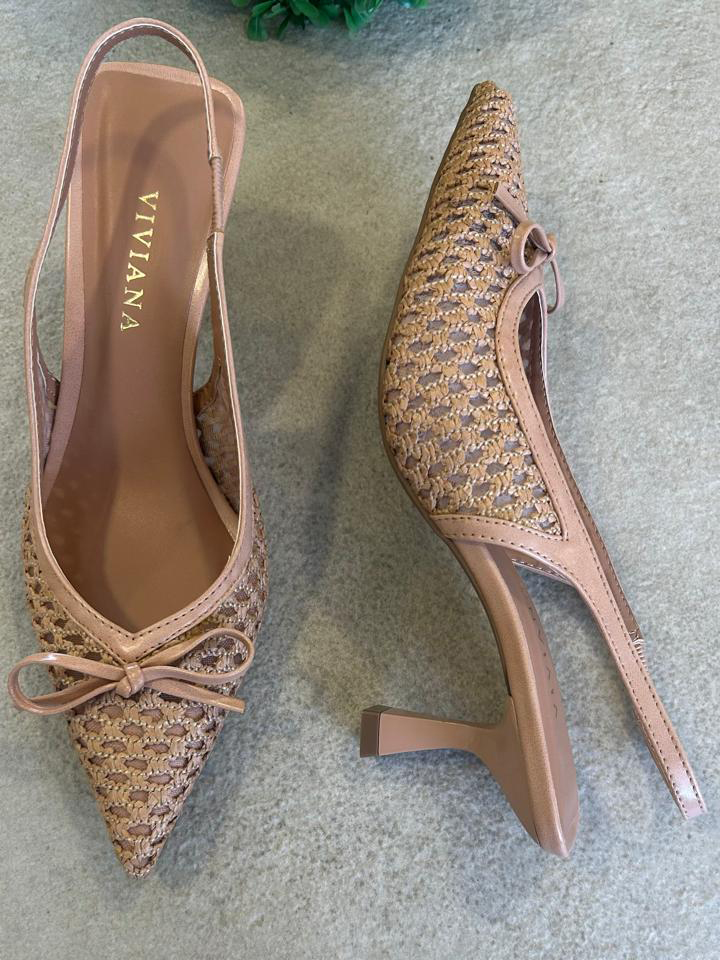 O Scarpin Slingback combina elegância e leveza em um design moderno e sofisticado. Confeccionado em material tramado com acabamento artesanal, traz o toque natural do tom angelim, perfeito para produções neutras e elegantes. O bico fino alonga a silhueta, enquanto o laço delicado na parte frontal adiciona feminilidade. O salto fino de altura média garante conforto e charme em cada passo — ideal para quem busca um visual refinado e atemporal.